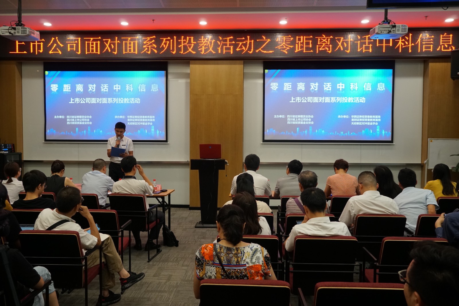 8月28日下午, 中科信息 (證券代碼:300678)參加了由四川省證券期貨業(yè)協(xié)會、四川省上市公司協(xié)會、四川投資基金業(yè)協(xié)會主辦的上市公司面對面系列投資者教育活動。此次活動主題為“零距離對話中科信息”,中科信息董事會秘書尹邦明、財務(wù)總監(jiān)劉小兵、四川省上市公司協(xié)會會員部副主任黃慶華及四川省內(nèi)部分機構(gòu)及個人投資者100余人參與了本次活動。